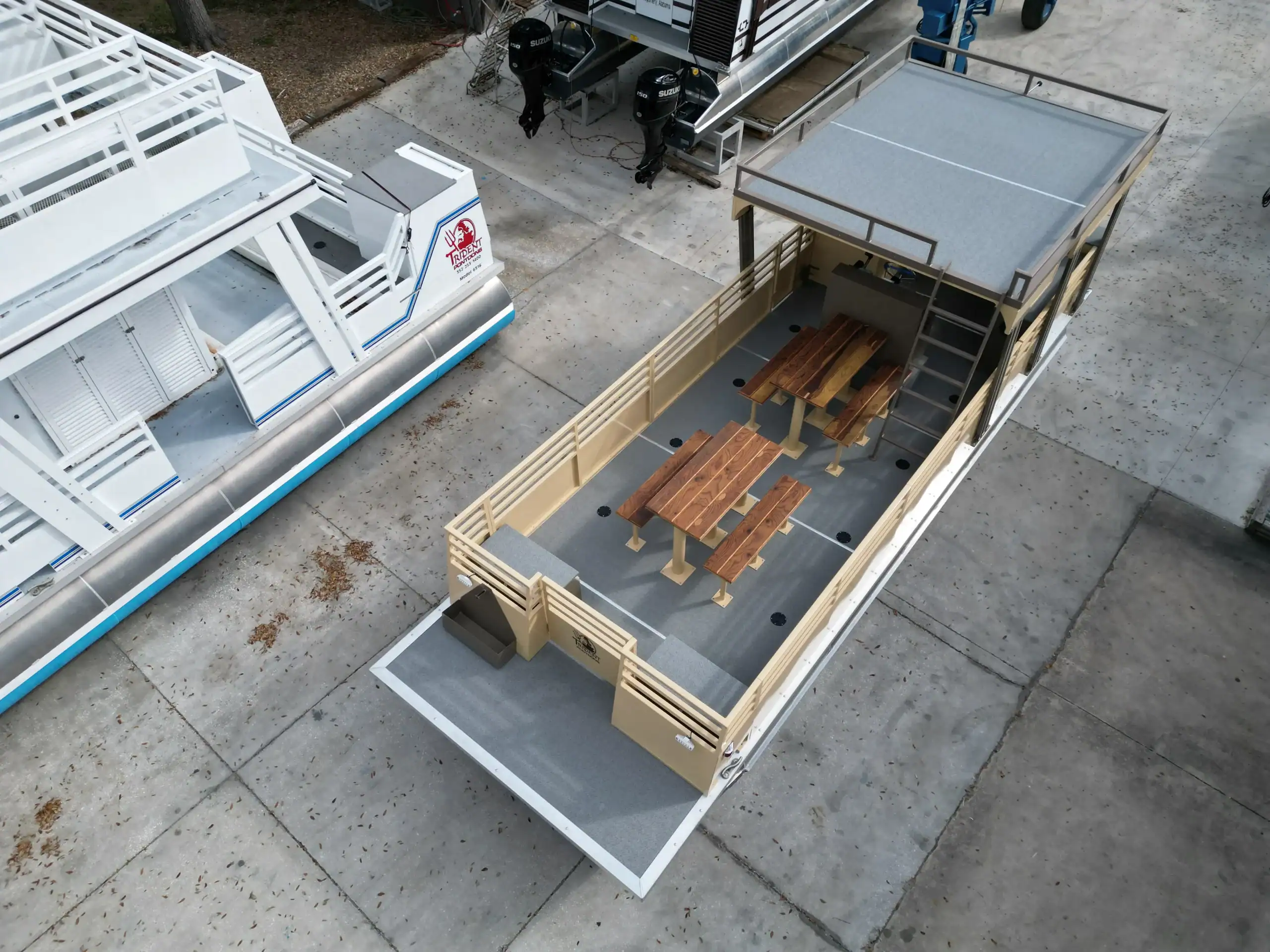 With three standard transom designs, all Trident Pontoons are available in a single or dual motor option. Transoms can be configured center between pontoons or pontoon mounted transoms. Note: Dual Center Transom is not available on 10′ wide models.